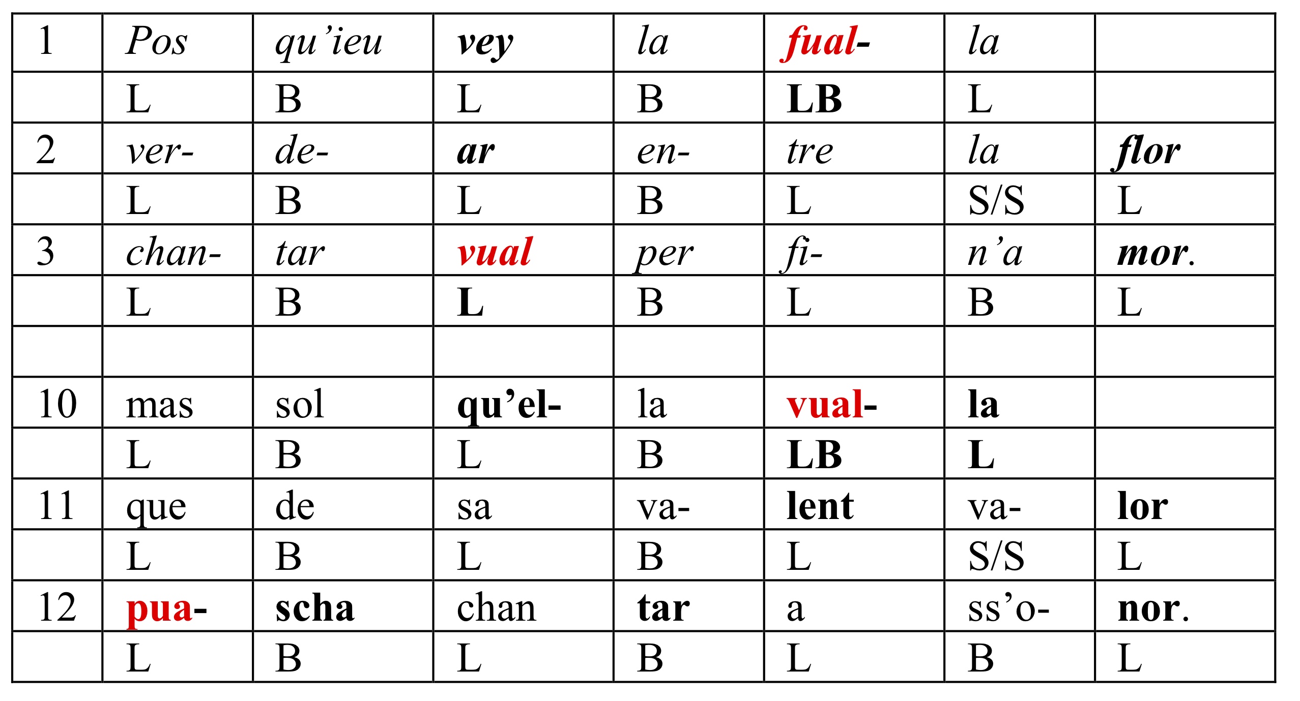 Tableau 4 – Alternance des longues (L), brèves (B) et semi-brèves (SB) dans le schéma mélodique de BdT 461.196