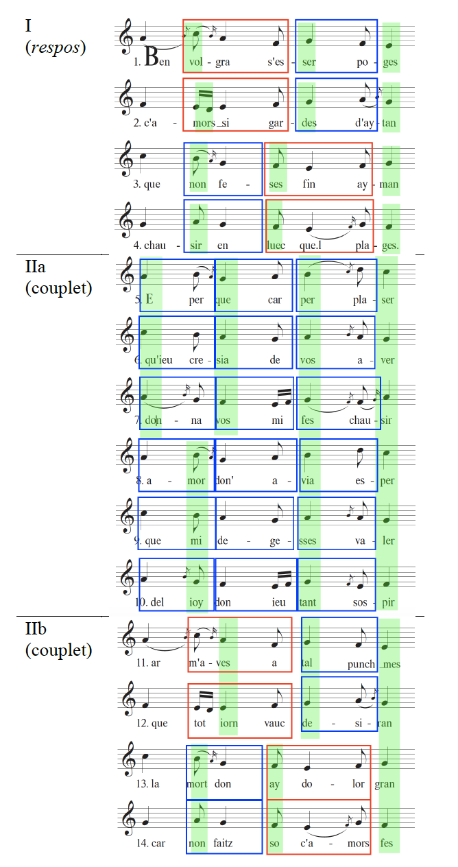 Fig. 3 – Rythme prosodique et musical dans BdT 244.1a (transcription et édition musicale : C. Chaillou-Amadieu, éd. du texte : A. Radaelli)